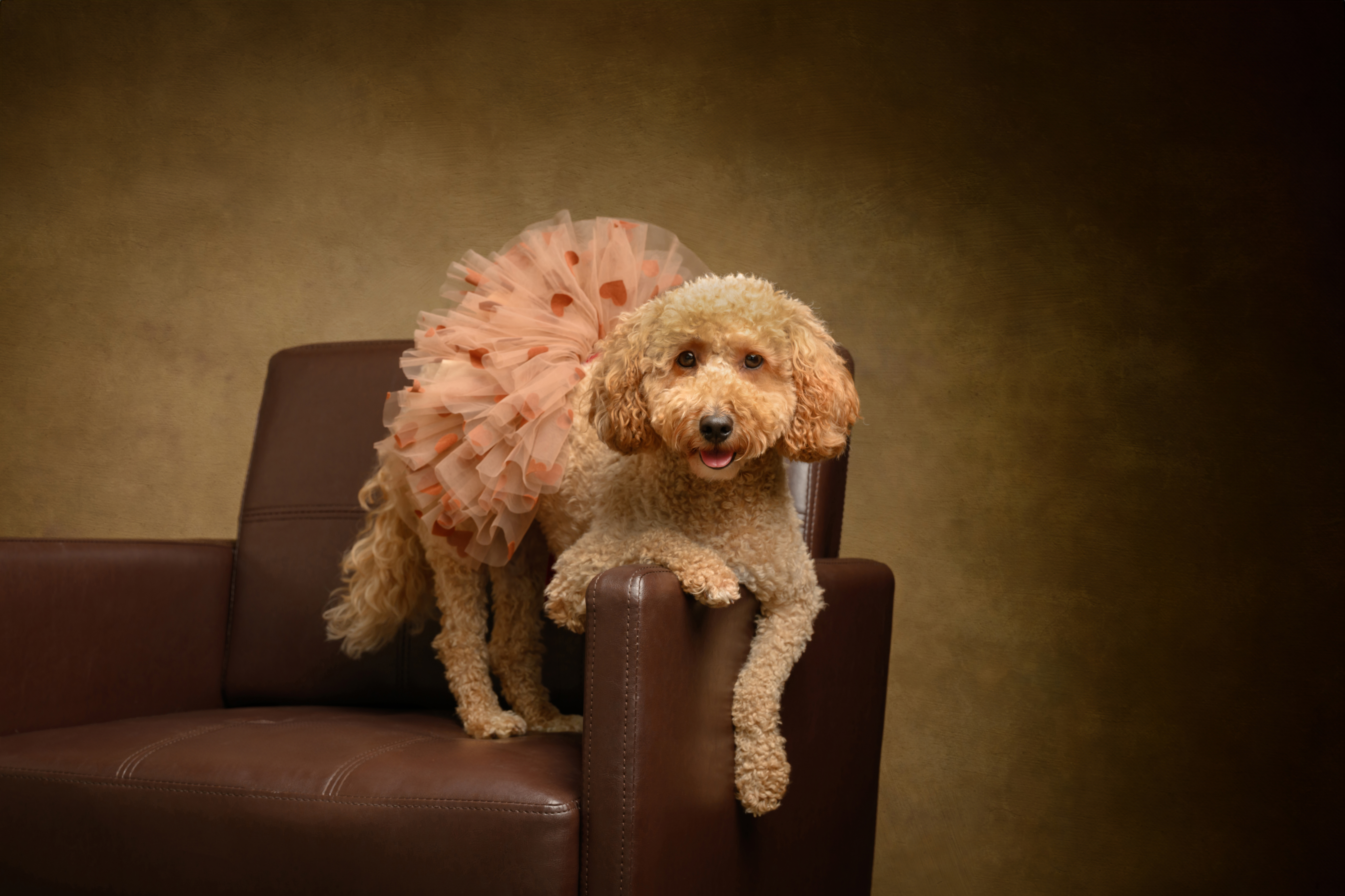 Your $100 studio fee covers your appointment for your fine art portrait experience in our studio with our expert pet photographer, and your choice of props, furniture, and outfits.